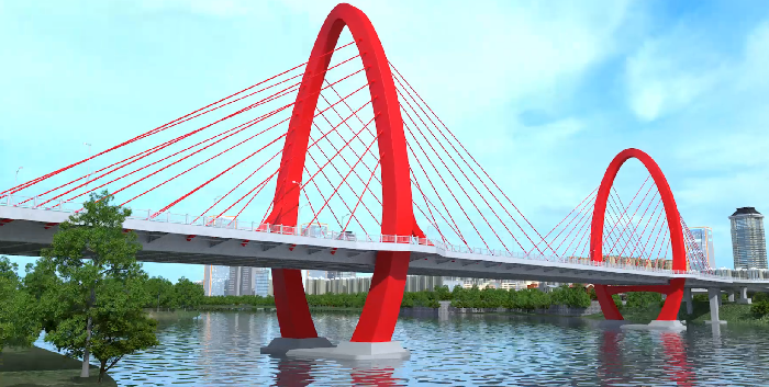 芝山桥南起福建省漳州市江滨路,跨越九龙江西,止于瑞京路—芝山南路交叉口,是福建省重点工程。主桥长300米,桥面宽36米,双向6车道,采用双塔双索面斜拉桥。福船集团承接其中钢梁、钢塔柱制作及安装工程,工程总量约0.5万吨。其中编制并实施的钢主塔无支撑搭载方案充分体现了马尾造船的技术实力。 -